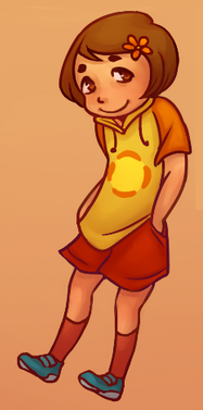 Chie has short light-brown hair with a hairpin/hairclip of an orange flower, and dark orange/brown shorts (sometimes drawn as a skirt).