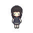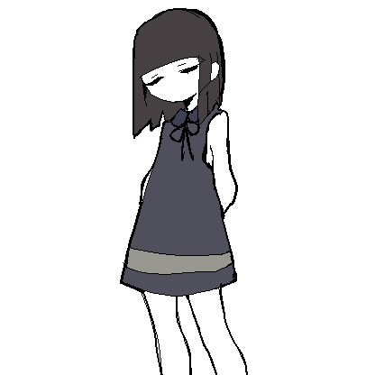 H2O has shoulder-length dark brown hair with blunt bangs and worn in a hime cut. She wears a grey sleeveless collared dress with a light grey horizontal stripe, judging by the title screen and sprite, H2O probably don't wear any shoes at all but have a some kind of bracelets on legs and a ribbon tied around her neck.