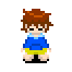 Mukatsuki has spiky light brown hair, a blue hoodie, yellow pants and bare feet.