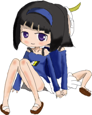 Shirayuki has short straight black hair, cut like a short hime cut. She has a blue headband in her hair. She wears a black tank top with a blue low-shoulder long-sleeved shirt over it. The shirt has a 2 white, 2 yellow and 2 black squares pattern. She has a white skirt and brown sandals.